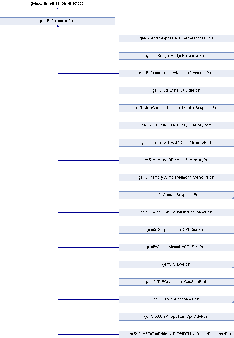 Implemented in gem5::memory::CfiMemory::MemoryPort, gem5::AddrMapper::MapperResponsePort, gem5::SimpleCache::CPUSidePort, sc_gem5::Gem5ToTlmBridge< BITWIDTH >::BridgeResponsePort, gem5::SimpleMemobj::CPUSidePort, gem5::memory::SimpleMemory::MemoryPort, gem5::TokenResponsePort, gem5::X86ISA::GpuTLB::CpuSidePort, gem5::CommMonitor::MonitorResponsePort, gem5::Bridge::BridgeResponsePort, gem5::LdsState::CuSidePort, gem5::SerialLink::SerialLinkResponsePort, gem5::MemCheckerMonitor::MonitorResponsePort, gem5::TLBCoalescer::CpuSidePort, gem5::memory::DRAMsim3::MemoryPort, gem5::memory::DRAMSim2::MemoryPort, gem5::StubSlavePort, and gem5::QueuedResponsePort.