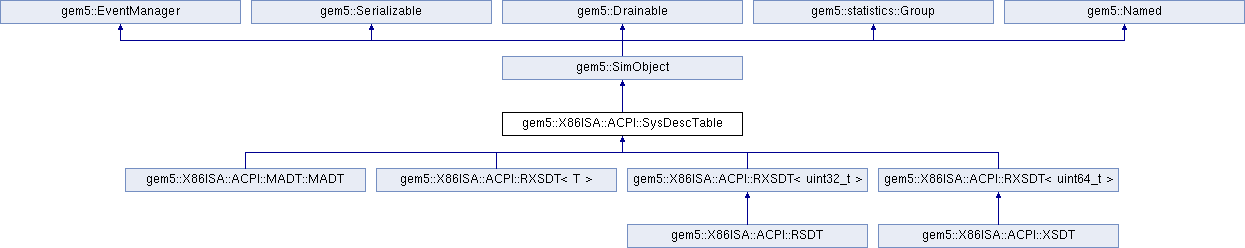 gem5::SimObject gem5::EventManager gem5::Serializable gem5::Drainable gem5::statistics::Group gem5::Named gem5::X86ISA::ACPI::MADT::MADT gem5::X86ISA::ACPI::RXSDT< T > gem5::X86ISA::ACPI::RXSDT< uint32_t > gem5::X86ISA::ACPI::RXSDT< uint64_t > gem5::X86ISA::ACPI::RSDT gem5::X86ISA::ACPI::XSDT