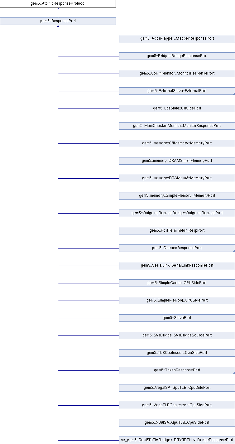 Implemented in gem5::ResponsePort, gem5::SysBridge::SysBridgeSourcePort, gem5::memory::MemCtrl::MemoryPort, gem5::CoherentXBar::CoherentXBarResponsePort, gem5::NoncoherentXBar::NoncoherentXBarResponsePort, gem5::memory::CfiMemory::MemoryPort, gem5::memory::SimpleMemory::MemoryPort, and sc_gem5::Gem5ToTlmBridge< BITWIDTH >::BridgeResponsePort.
