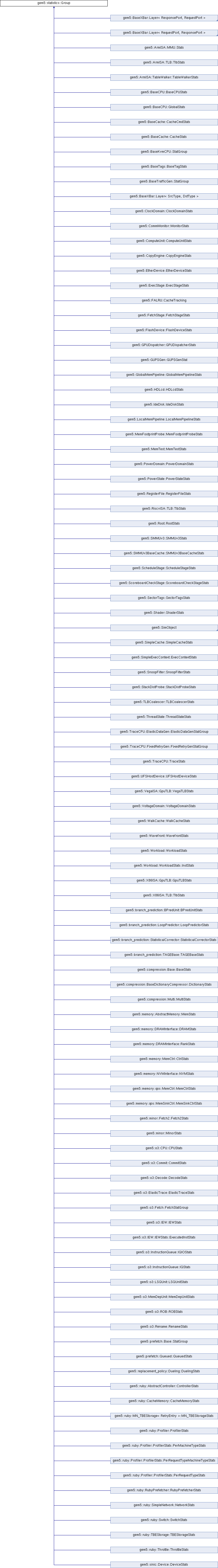 A stat group is a hierarchical structure that contain statistics and other groups. Groups are used by the stat system to reflect gem5's SimObject hierarchy and to expose internal hierarchy within an object. They can also be used to conveniently group stats into their own class/struct and then be merged into the parent group (typically a SimObject).