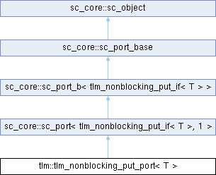Public Member Functions inherited from sc_core::sc_port< tlm_nonblocking_put_if< T >, 1 > | |